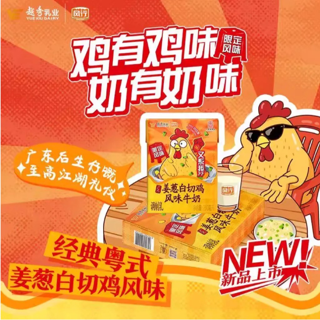 White sliced chicken, baiqieji, is a classic starter in Cantonese cuisine. It is chicken cooked in a broth with ginger and scallions, served cold to be dipped in soy sauce. Yuexiu Dairy is producing a ‘ginger scallion white sliced chicken milk’. A cool looking chicken is showing a glass of the milk alongside the original dish.
