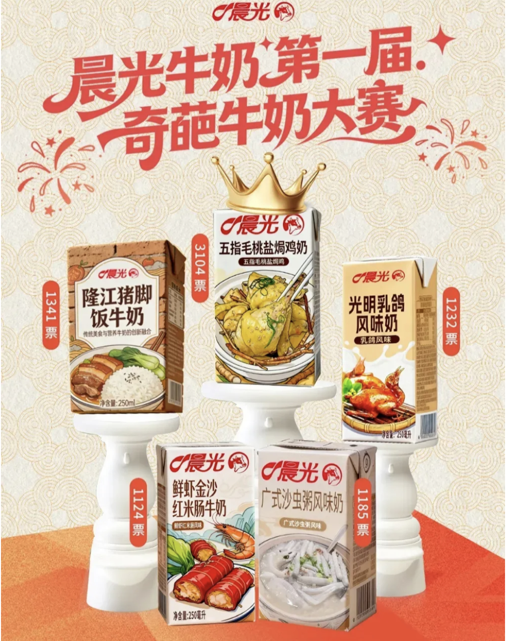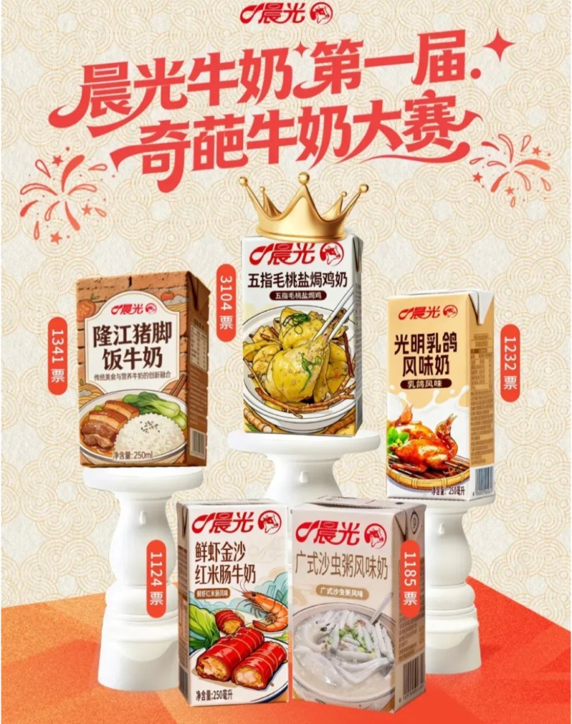 Dim sum, a table full of small plates with savoury delicacies is a favourite lunch in Guangdong province. Chenguang Dairy from Shenzhen has developed a series of milks mimicking some favourite dim sum.