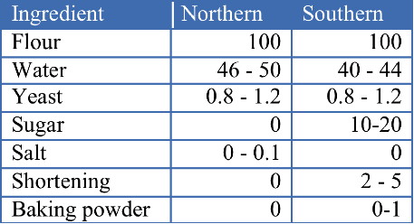 The following table shows a typical formulation of Northern and Southern steamed bread (unit: %).