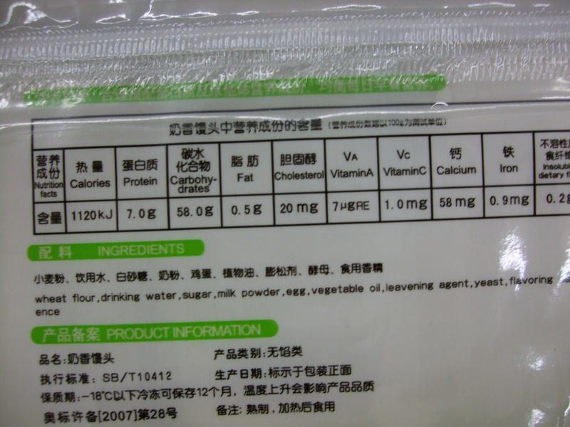 Here is a picture of the ingredients and nutrition information of Sinian’s ‘milk flavoured mantou‘