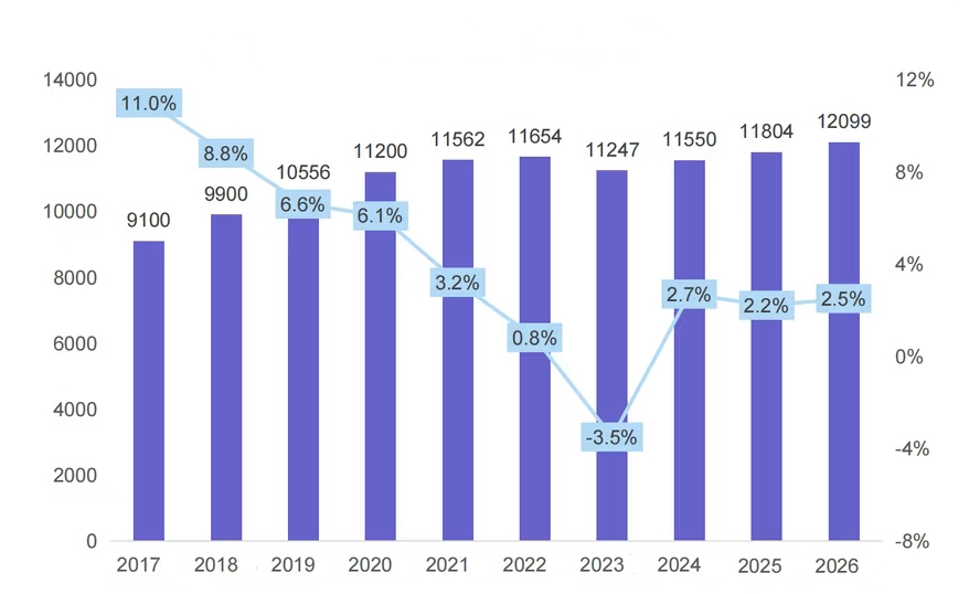 The following table shows the development of the market and the projections for 2026 (Value in RMB 100 mln and Growth in %).