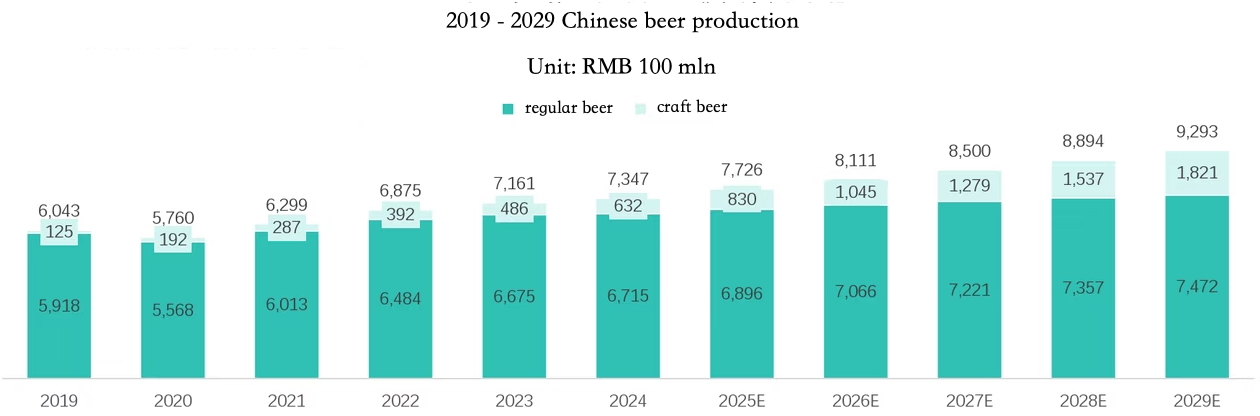 The following table shows the development of Chinese beer production up to projections for 2029. It includes a breakdown in industrial and craft beer.