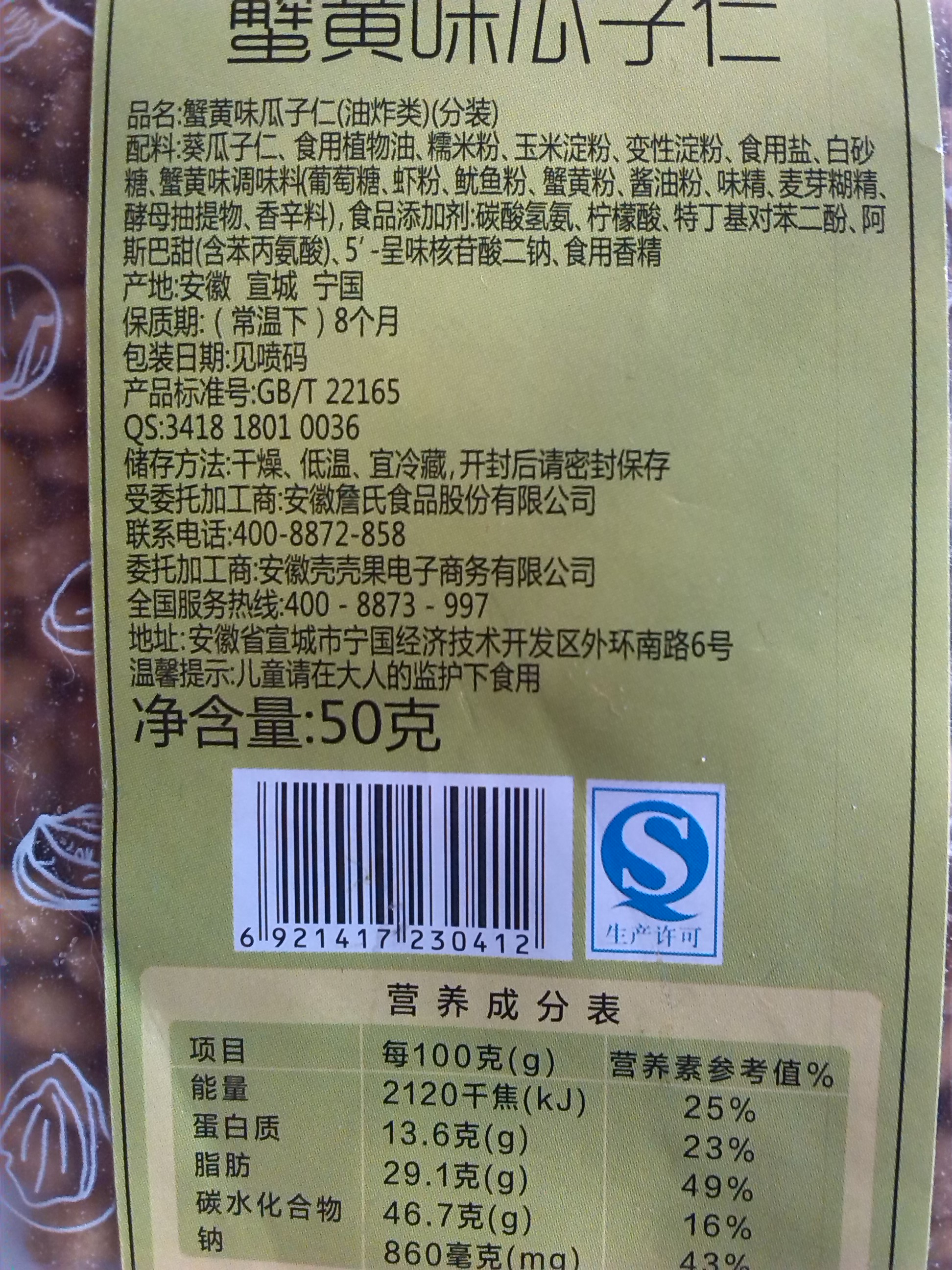 Ingredients: sun flower seed kernels, vegetable oil, glutinous rice powder, corn starch, modified starch, salt, crystal sugar, crab roe seasoning (glucose, shrimp powder, squid powder, crab roe powder, soy sauce powder, MSG, dextrin, yeast extract, spices), food additives: ammonium bicarbonate, citric acid, tert-butylhydroquinone (TBHQ), aspartame, disodium 5’-ribonucleotide, food flavour