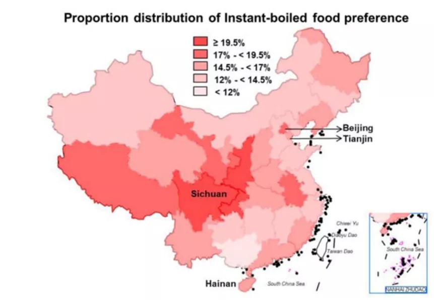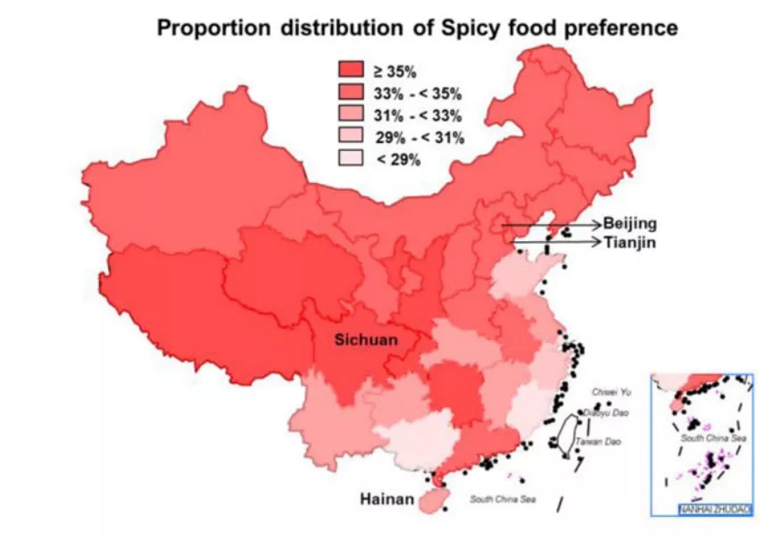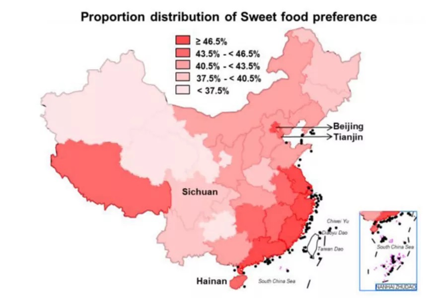 Chinese research has shown that there are regional preferences for different ways of cooking food (boiling, grilling, frying, etc.) and in liking for sweet, spicy (la, the effect of chili peppers [lajiao]) or mouth-numbing food (ma, the effect of Sichuan peppers [huajiao]). I am adding a few maps showing these preferences.