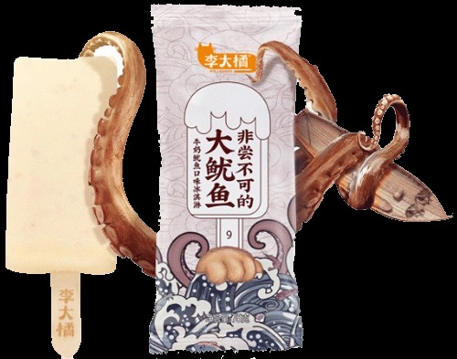 Lidaju has designed what could be the weirdest type of savoury ice cream: fishy-flavored ice cream with bits of dried squid in it. This is someone I would only recommend to the seasoned lover of crazy foods. This is corroborated by the sub-text on the packaging feichang bu kede ‘very improper’.