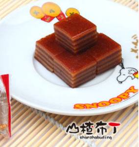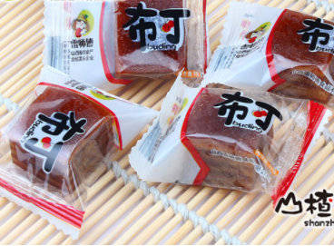 Hawthorn is a long-time favourite ingredient for sweets in China. I mentioned the traditional North-China tanghulu, skewers of candied hawthorns in my post on Chinese desserts. Present day food technologists can do a lot more with hawthorns. These ‘puddings’ are stacks of layers of darker and lighter coloured sweetened hawthorn paste. They are moist, with a good sour-sweet balance. They go well with cup of tea, Pu’er or Early Grey, hawthorn has no nationalist preferences.