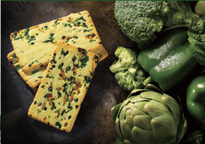 This innovative product is marketed under the category ‘coarse biscuits’, but actually does not contain any type of flour. The batter is almost entirely made from juice and powder from a host of vegetables. Some cheese derivative has been added to enhance the flavour.