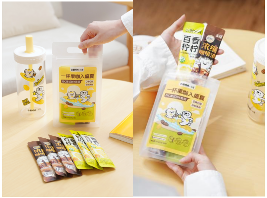 Otter Dundun, producer of freeze dried instant fruit drinks and coffee maker Yongpu have jointly developed a combination instant fruit + coffee drink. This concept falls under the category of dirty coffee that got in vogue in China in the mid 2020s. It is marketed as a 0 sugar 0 fat beverage.