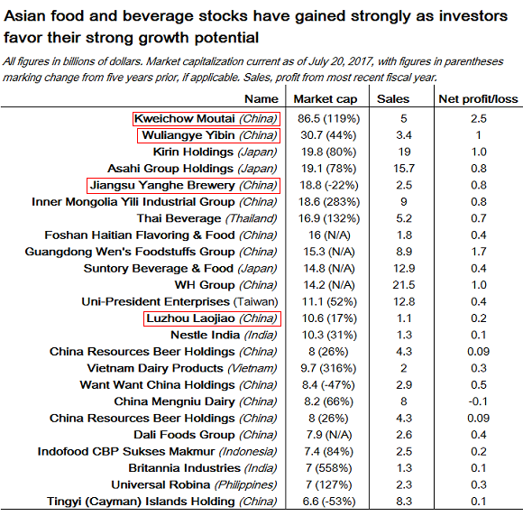 The following picture shows how well Chinese spirits companies are appreciated among international investors. The stocks marked in red are baijiu producers.