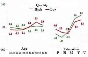 Similar curves can be observed for the various levels of education. The letters refer to the highest diploma of the respondents; legend: P = primary school, H = high school; M = intermediate vocational; V = higher vocational; U = university. It is not easy to explain why people with a higher education would drink more baijiu, while you would expect them to be more interested in wine. However, when they drink it, they prefer the high end brands.